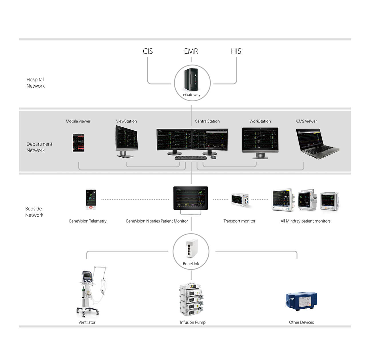 The BeneVision CentralStation also makes information accessible beyond the central nursing station or centralized monitoring center through distributed BeneVision ViewStations, and Workstations, and even smartphones to optimize clinical productivity. And bi-directional communications with ADT and EMR solutions are streamlined with the Mindray eGateway Integration.